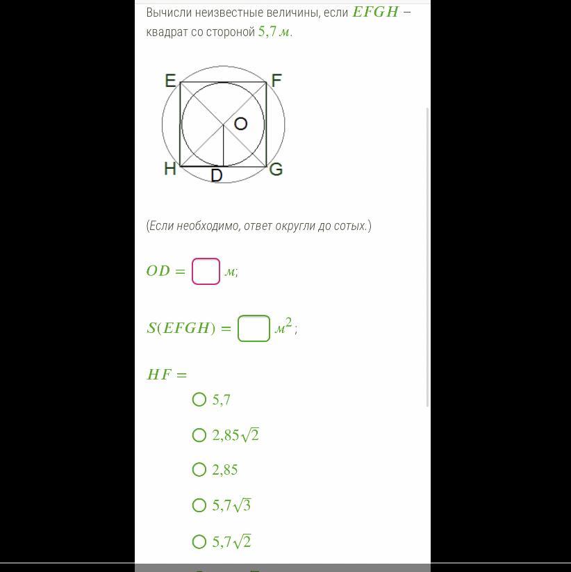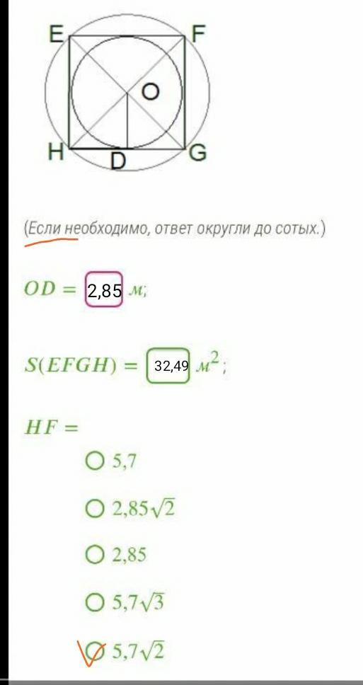 OD будет равна половине стороны, т.е. 2.85. Площадь квадрата, понятно, 32.49 (S=x^2). HF по теореме Пифагора равна 8.06, так как ответ просят округлить до сотых по условию.