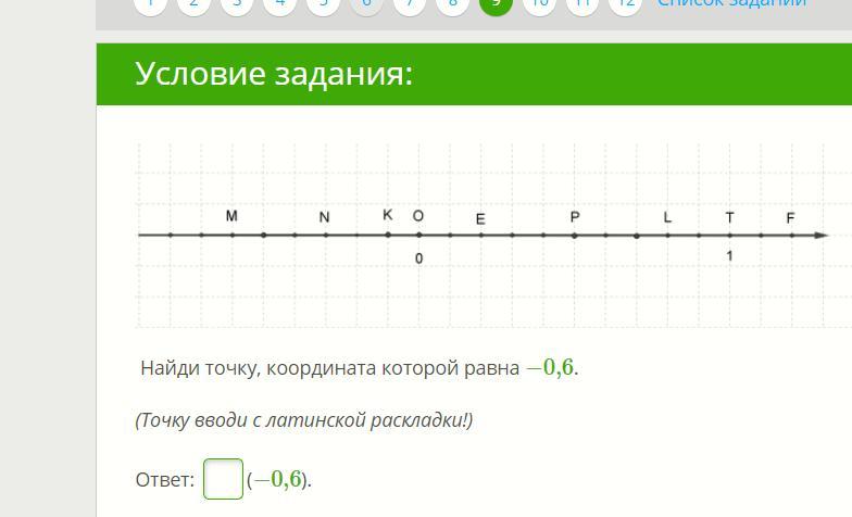 Расстояние от точки М до начала отсчёта равно 0,6, эта точка расположена слева от нуля, поэтому М(-0,6).