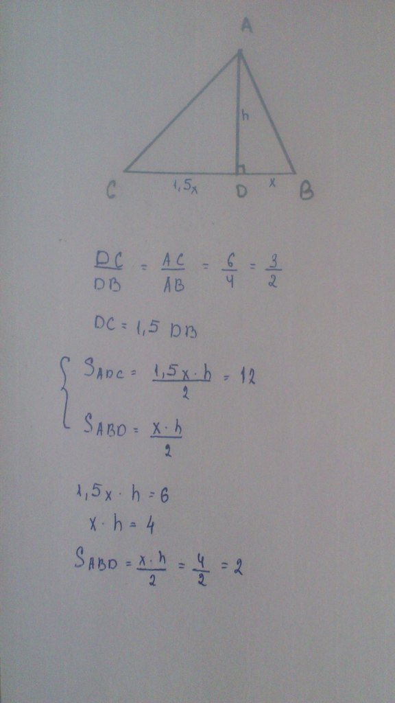 Помогите пожалуйста!!! очень срочно надо!! в треугольнике авс ав=4см, ас=6см, ад-высота и биссектриса, площадь треугольника адс=12см2, найти площадь авд
