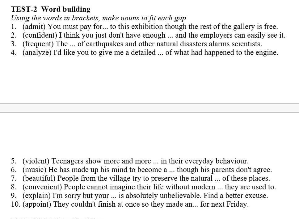 1 admittance 2 confidence 3 frequency 4 analysis 5 violince 66 musician 7 beauty 8 conveniences 9 explanation 10 appointment
