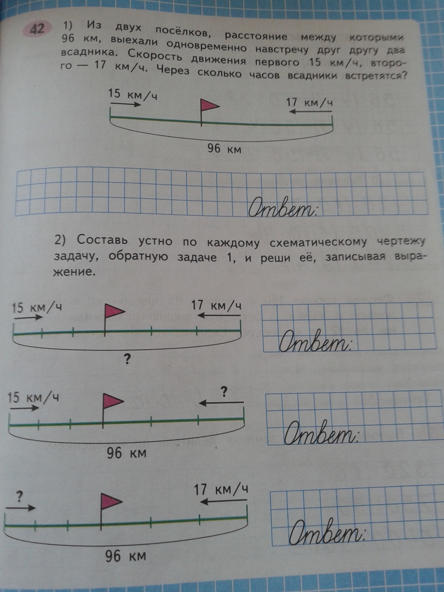 2. Из двух поселков, расстояние между которыми 96 км вышли 2 всадника. С какой скоростью двигался второй всадник, если они встретились через 3 часа