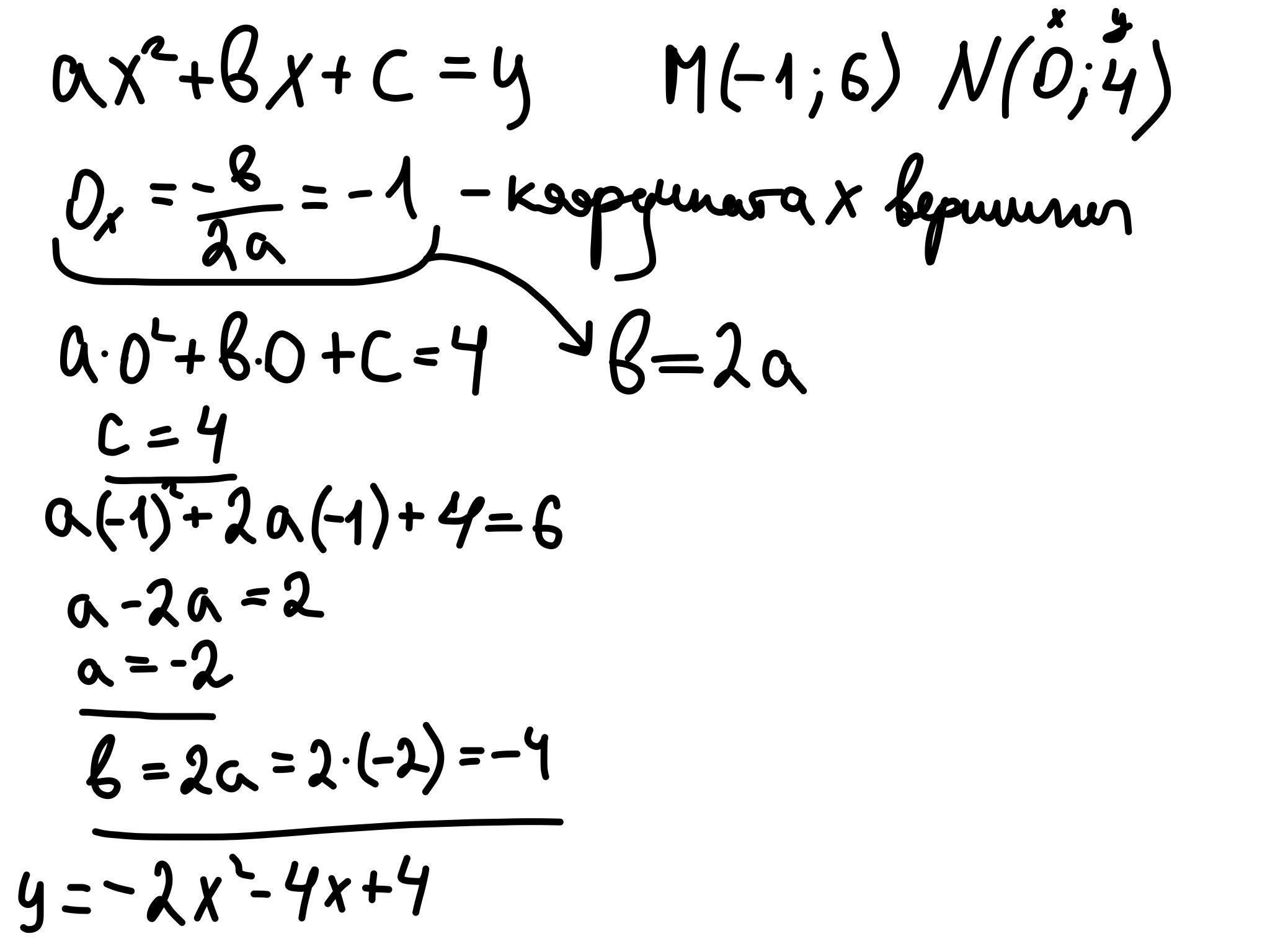 Парабола y=ax²+bx+c имеет вершину в точке C(-1; 6) и проходит через точку D(0; 4). Найдите значения коэффициентов a, b и c.