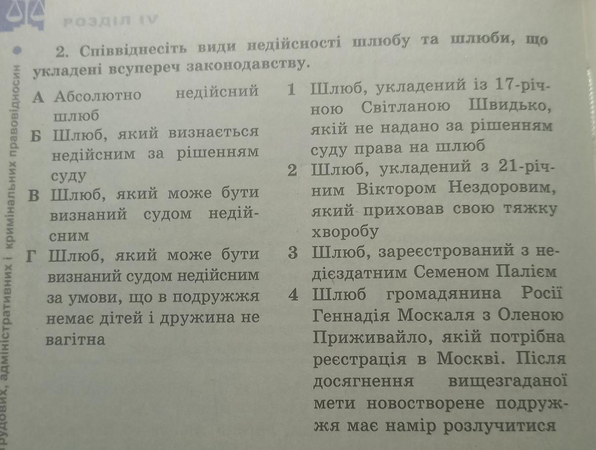 Г. Шлюб, який може бути визнаний судом недійсним за умови, що в подружжя немає дітей і дружина не вагітна - 1. Шлюб, укладений із 17-річною Світланою Швидько, якій не надано за рішенням суду права на шлюб (частина третя ст. 41 СКУ)