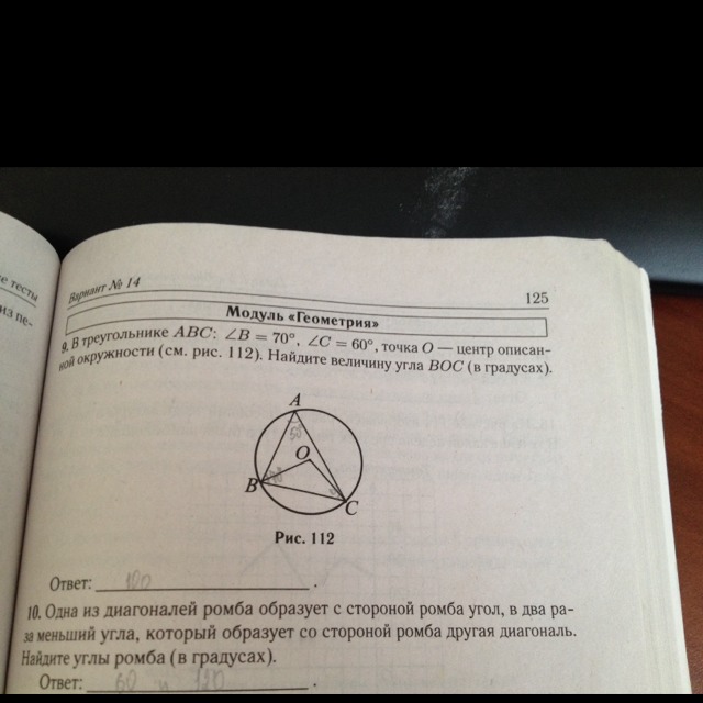здесь мы должны воспользоваться теоремой о вписанных углах. дуга АВ будет 60*2=120, дуга АС будет 140. Дуга ВС будет 360-120-140=100. Угол, который нам надо найти-центральный. Поэтому он равен дуге и равен 100 градусам.