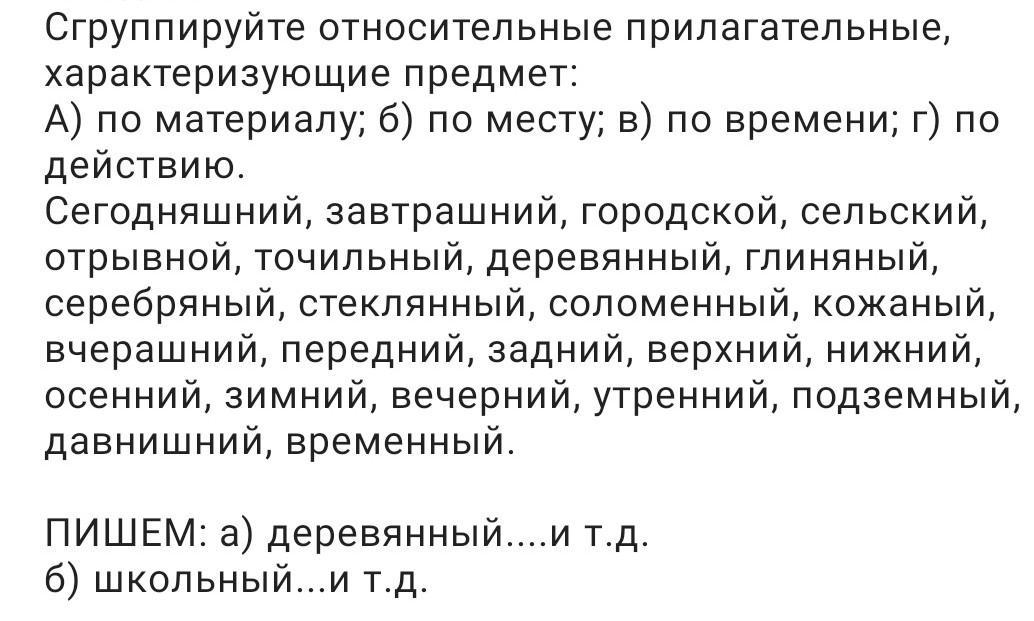 По времени:сегодняшний,завтрашний,вчерашний,вечерний,временный.По материалу:деревянный,глиняный,серебряный,стеклянный,соломенный,кожаный,давнишний,отрывной.По месту:городской,сельский,передний,задний,верхний,нижний,осенний,зимний,подземный.По действию:отрывной,точильный,