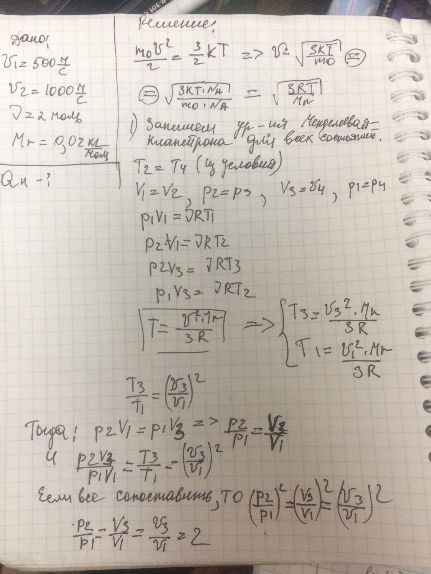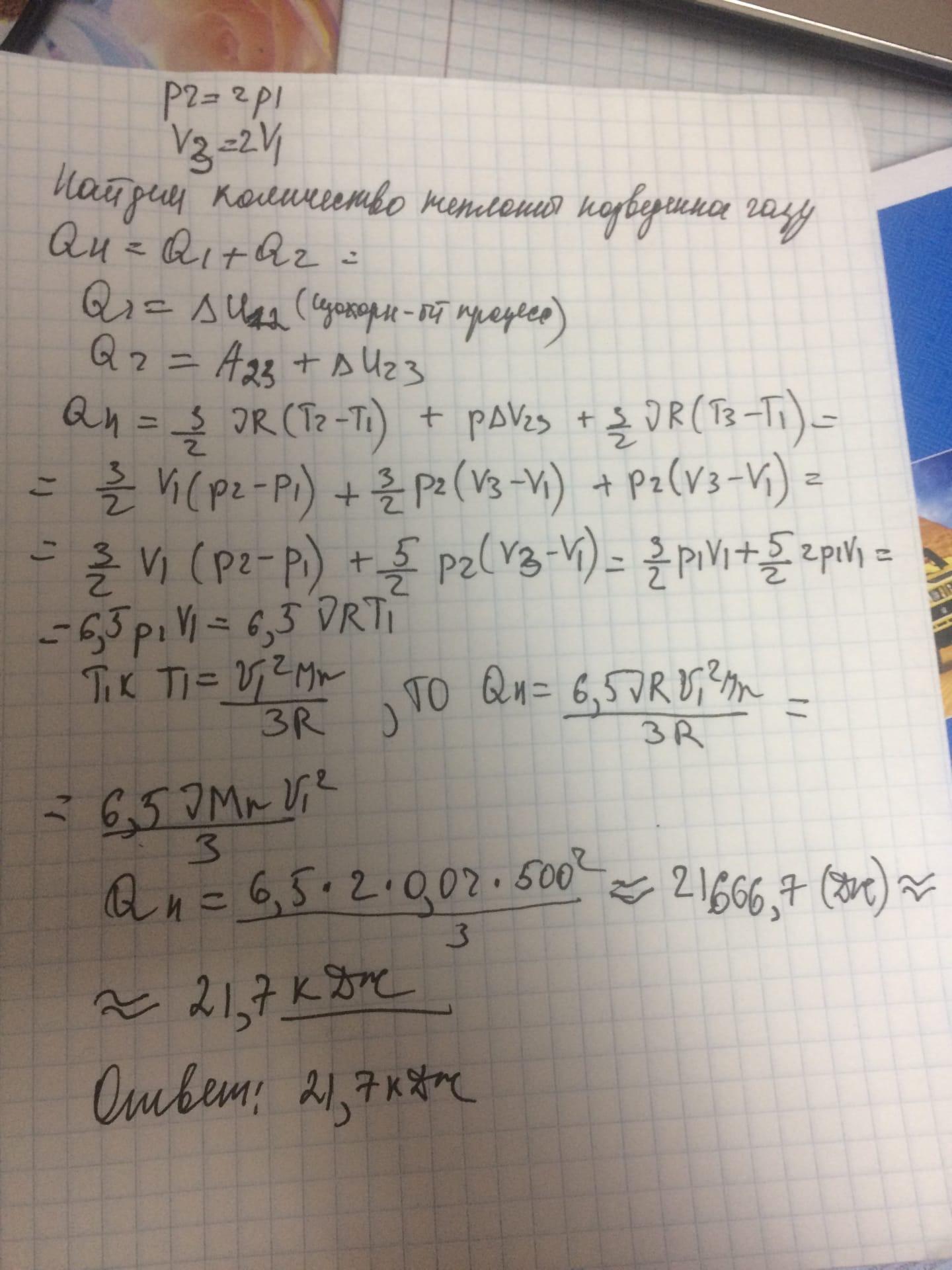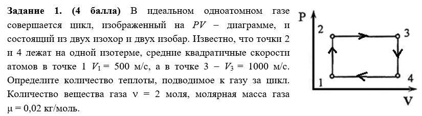 В идеальном одноатомном газе совершается цикл, изображенный на PV диаграмме, и состоящий из двух изохор и двух изобар. Ответ должен получится 21,7 кДж. Можно плс подробный разбор