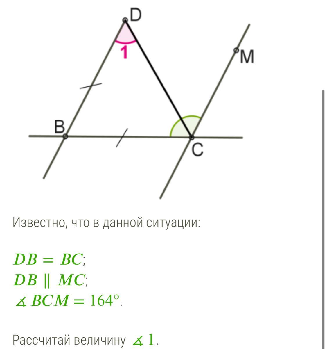 DC делит угол BCM пополам => BCD=BDC=164/2=82