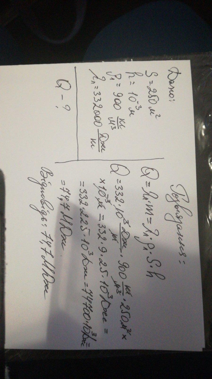 Поверхность воды водоема площадью 250 м² при 0°С покрылась льдом толщиной 1 мм. Какое количество теплоты выделилось при этом? Плотность льда 900 кг/м³