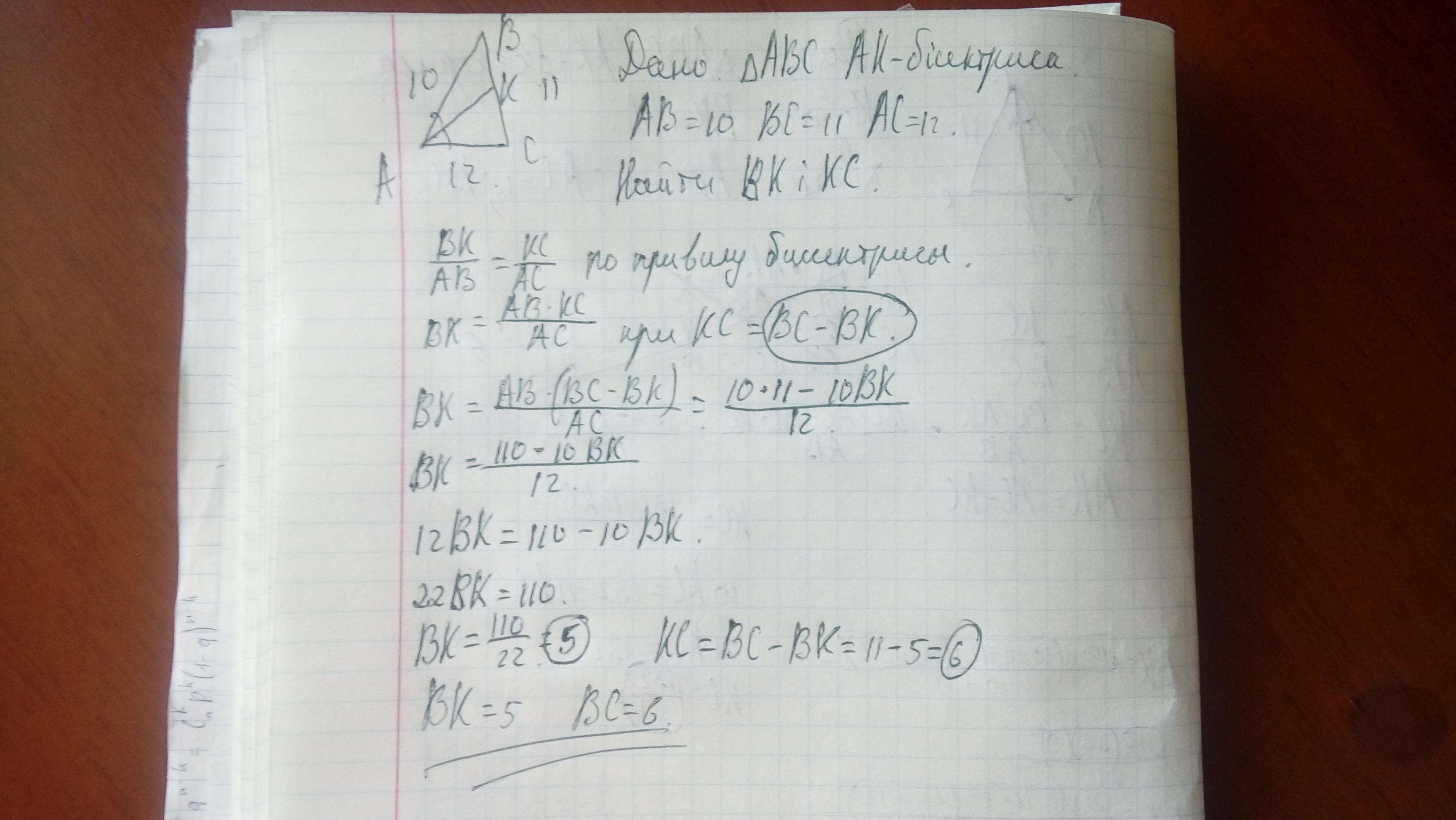 Биссектриса треугольника не только делит на две равные части угол из которого она опущена,но и делит противолежащую сторону в отношении длин прилежащих сторон