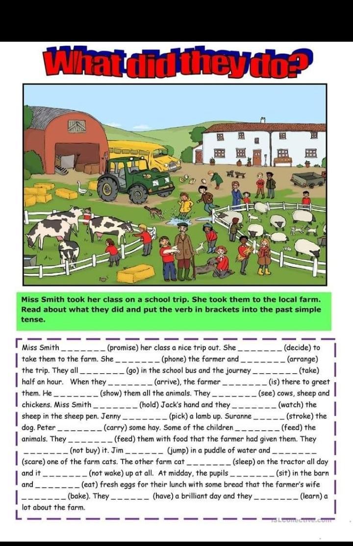 promised, decided, phoned, arranged, went, took, arrived, was, showed, saw, held, watched, picked, stroked, carried, fed, fed, didn't buy, jumped, scared, slept, didn't wake up, sat, ate, baked, had, learnt