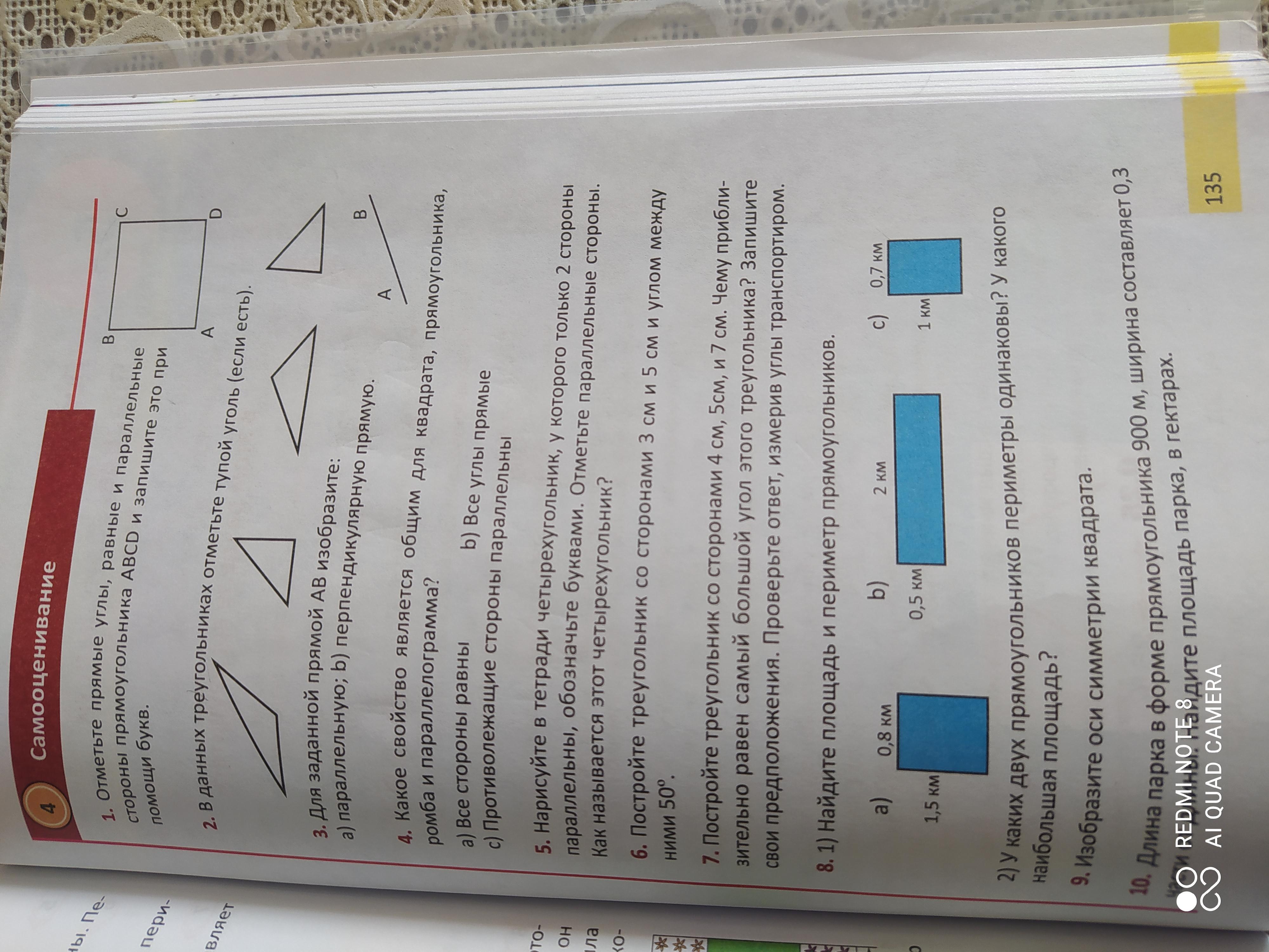 1) в прямоугольнике все углы прямые и параллельные стороны равны.