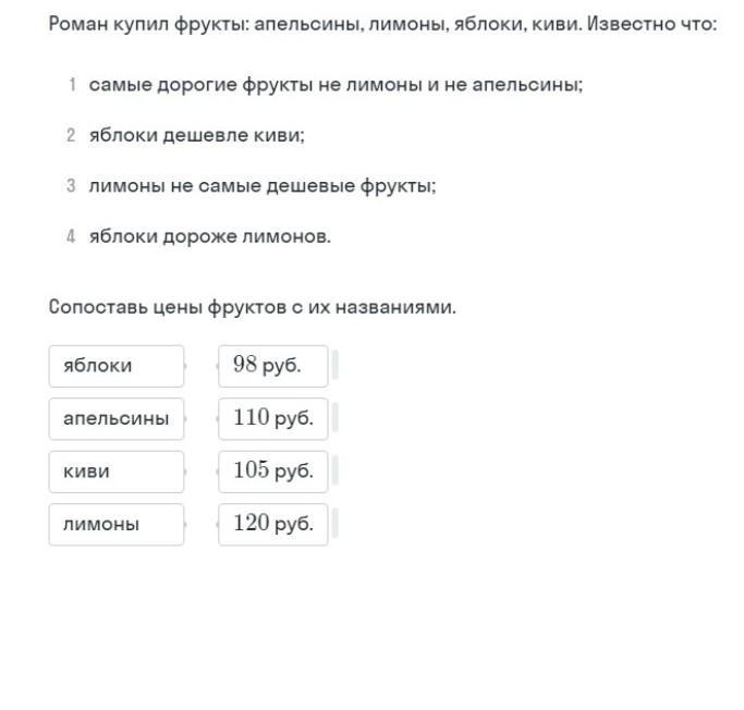 3) На первом месте киви, на втором яблоки. Остались лимоны и апельсины. 3. Лимоны не самые дешевые фрукты. Значит лимоны на третьем месте.