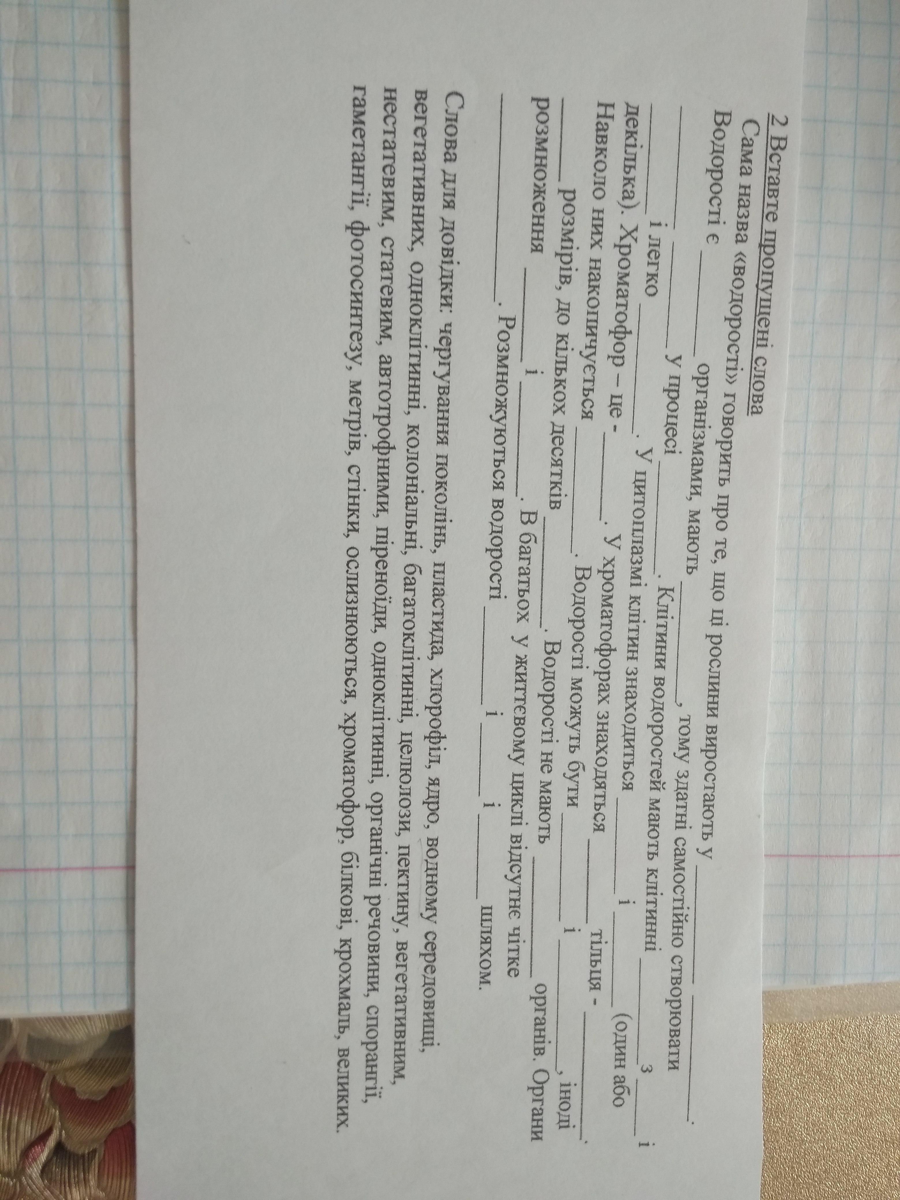 Сама назва «водорості» говорить про те, що ці рослини живуть у водному середовищі. Водорості є автотрофними організмами, мають хлорофіл, тому самостійно створюють органічні речовини в процесі фотосинтезу. Клітини водоростей мають клітинні стінки з пектину та целюлози і легко ослизнюються. У цитоплазмі клітин знаходяться ядро та хроматофор. Хроматофор це – пластида .У хроматофорах знаходяться білкові тільця – піреноїди . Водорості можуть бути одноклітинні, багатоклітинні та колоніальні. Водорості не мають вегетативних органів. Розмножуються водорості вегетативним, нестатевим та статевим шляхом.