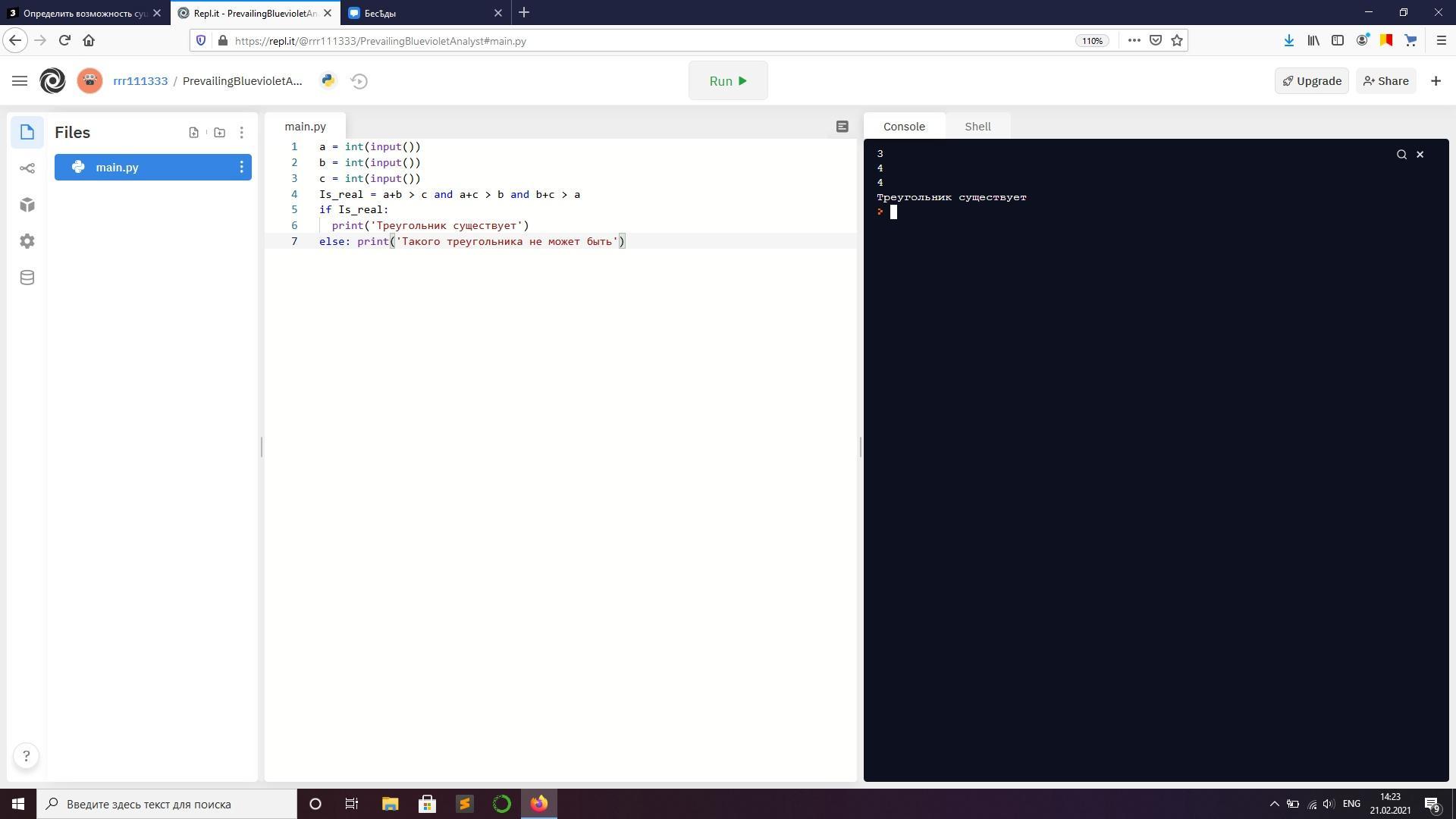 Определить возможность существования треугольника по сторонам(Треугольник существует только тогда, когда сумма любых двух его сторон больше третьей).Python