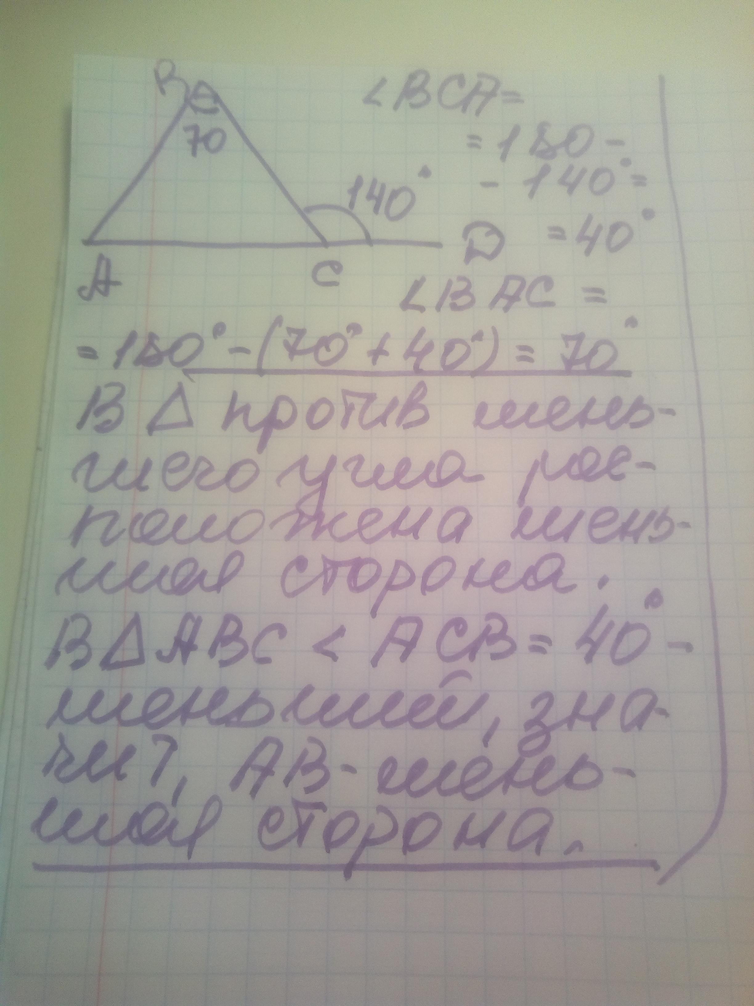 Зовнішній кут при вершині С трикутника АВС дорівнює 140, а внутрішній кут при вершині В-70. Укажітьнайменшу сторону трикутника