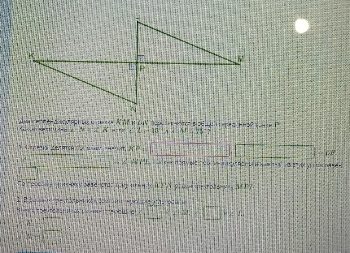 По первому признаку равенства треугольников, треугольник KPN равен треугольнику MPL, поэтому угол N равен углу L, а угол K равен углу M. Углы L и M