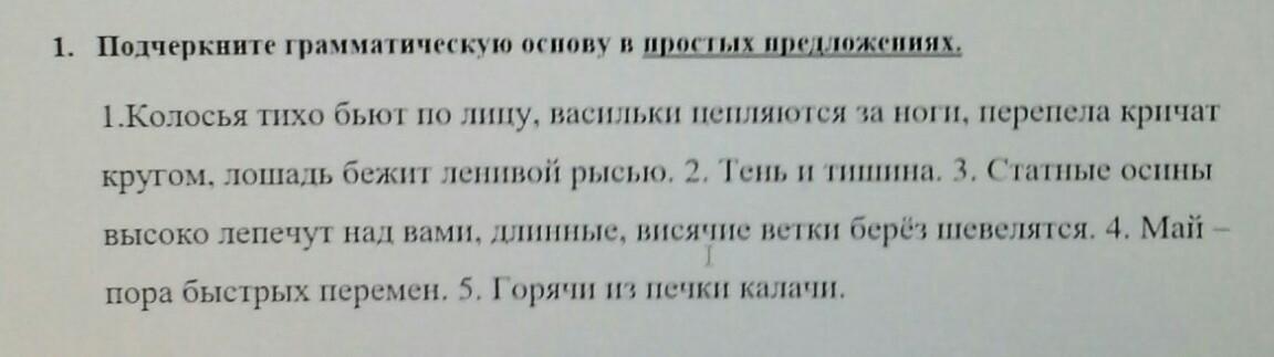 1) Первое предложение сложное, здесь несколько грамматических основ: колосья(подл) бьют(сказ); васильки(подл) цепляются(сказ); перепела(подл) кричат( сказ); лошадь(подл) бежит(сказ).