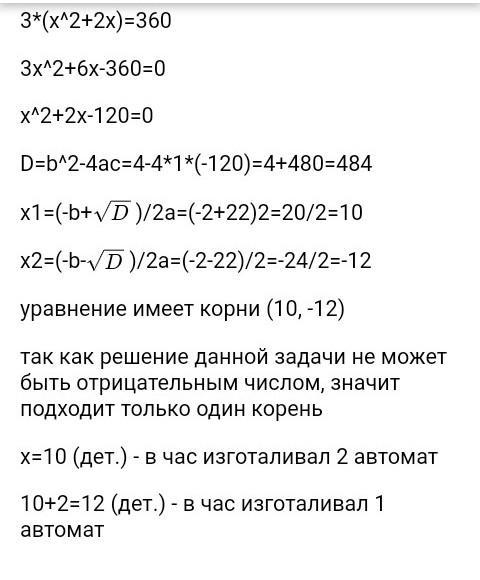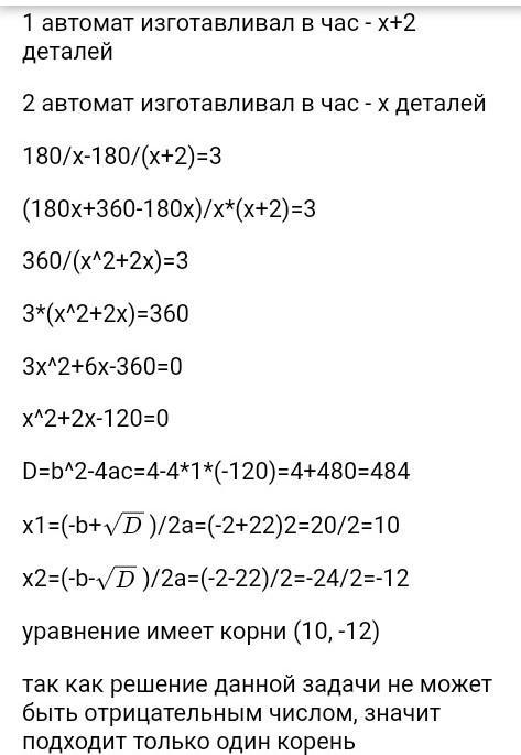 2. Два автомата должны были изготовить по 180 деталям. Первый автомат изготовил в час на 2 детали больше, чем второй, и поэтому закончил работу на 3 часа раньше. Сколько деталей изготовлял каждый автомат в час?