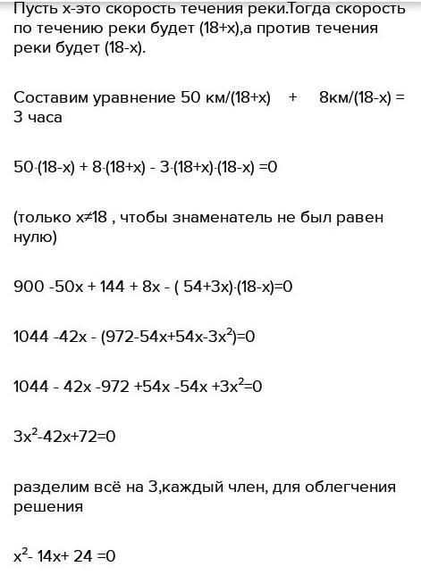 1. Теплоход, собственная скорость которого 18 км/ч, прошёл 50км по течению реки и 8 км против течения, затрат в на весь путь 3 часа. Какова скорость течения реки?