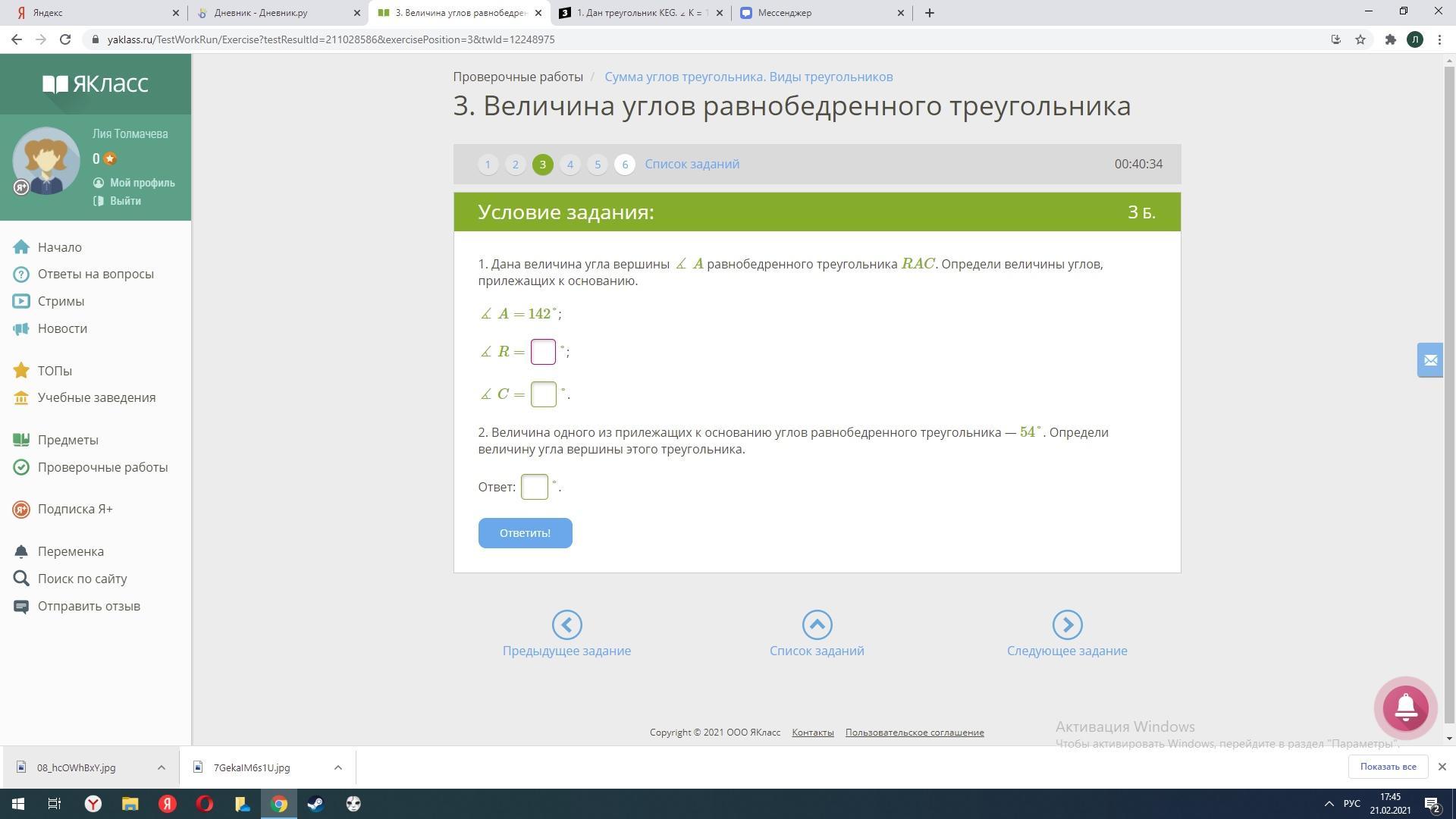 1. Дана величина угла вершины ∡ A равнобедренного треугольника RAC. Определи величины углов, прилежащих к основанию.