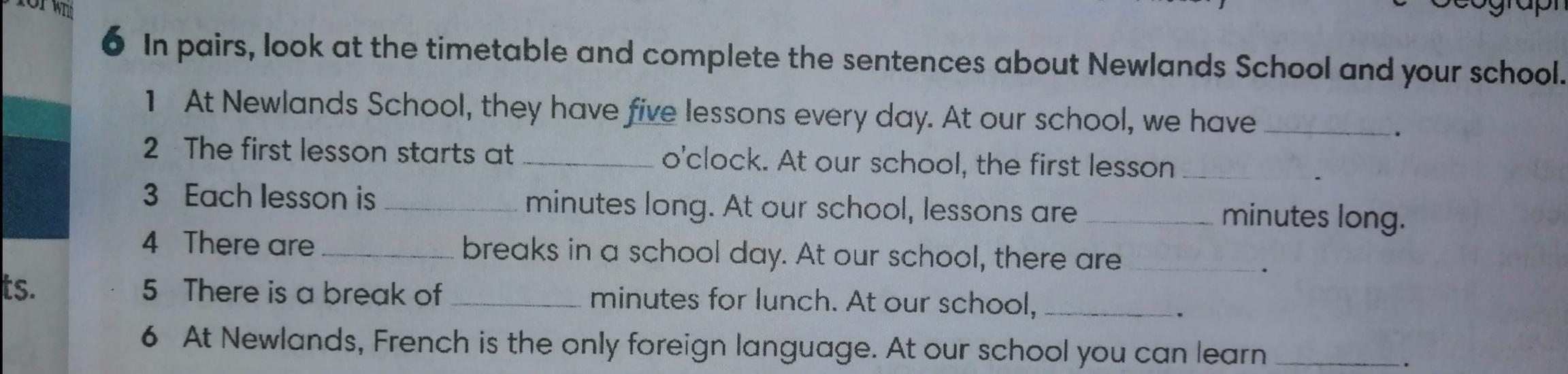 1) At Newlands school, they have five lessons every day. At our school, we have six lessons every day.