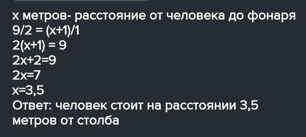 На каком расстоянии (в метрах) от фонаря стоит человек ростом 2 м, если длина его тени равна 1 м, высота фонаря 9 м?
