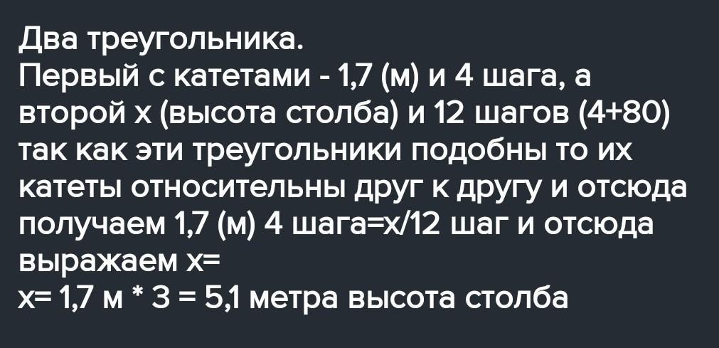 Человек ростом 1,7 м стоит на расстоянии 8 шагов от столба, на котором висит фонарь. Тень человека равна 4 шагам. На какой высоте (в метрах) расположен фонарь?