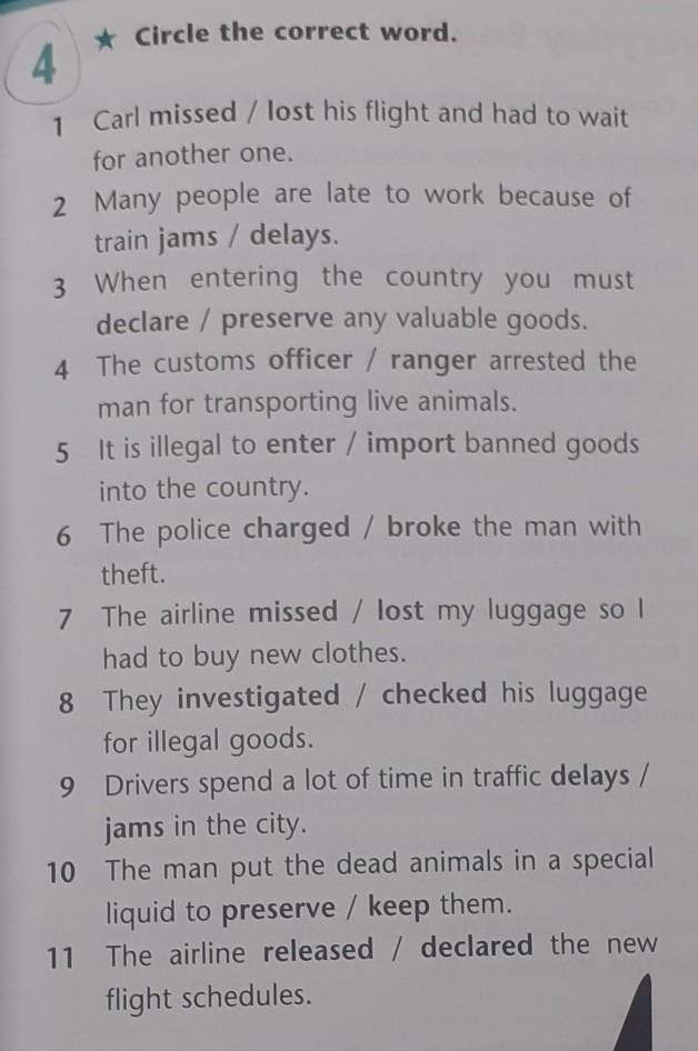 1 missed 2 delays3 declare 4 officer 5 import 6 charged 7 lost 8 checked 9 jams 10 keep 11 declared