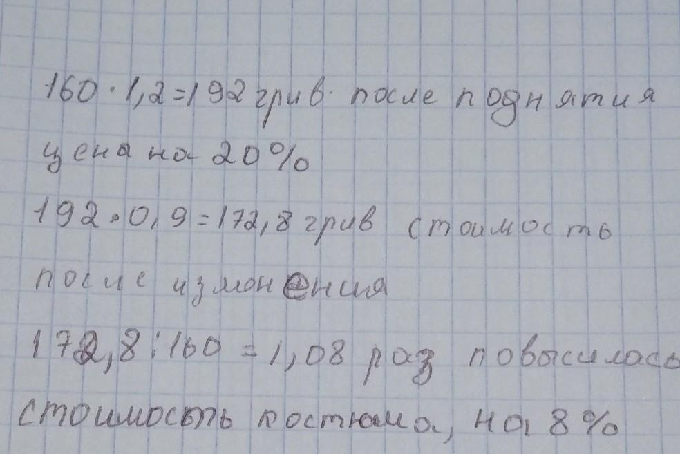Костюм стоил 160 гривен.Сначало его цену повысили на 20%,а потом уменьшили на 10%.Какой стала цена костюма после изменений?На сколько % изменилась начальная цена?