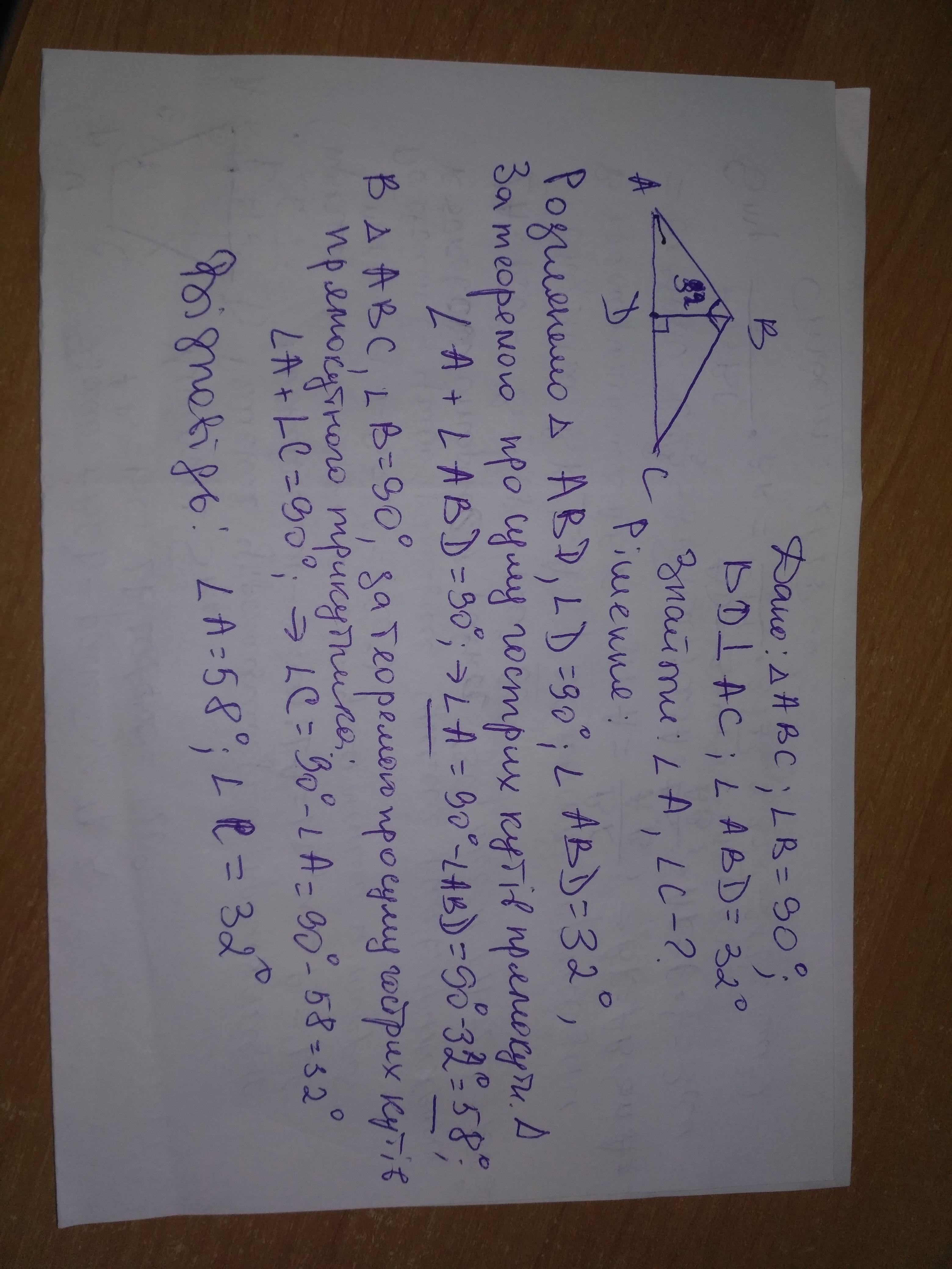 высота прямокутного трыкутныка опущена на гипотынузу утворюе з одным из катецив кут що доривнюе 32 градусы знайдить гости куты трыкутныка.