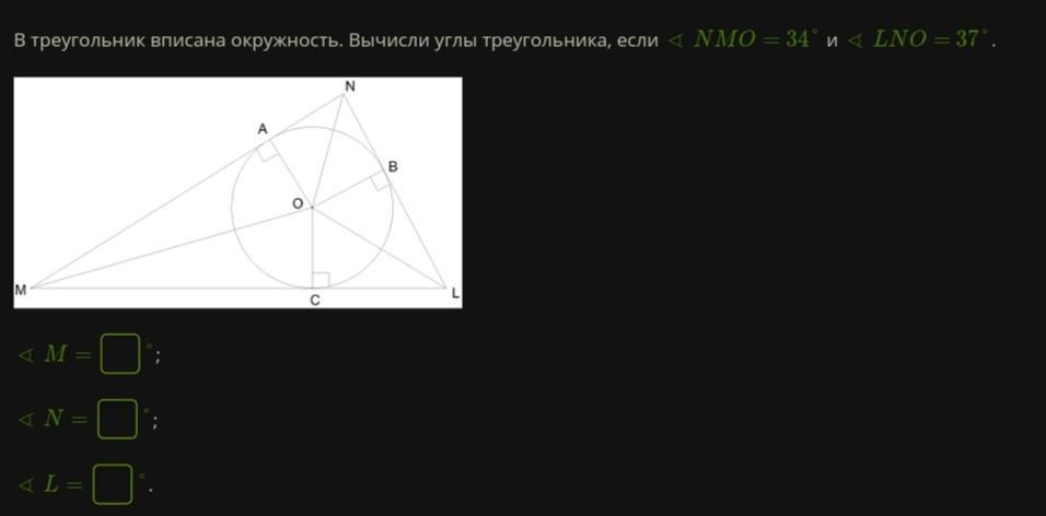 В треугольник вписана окружность. Вычисли углы треугольника, если ∢ NMO= 34° и ∢ LNO= 37°.