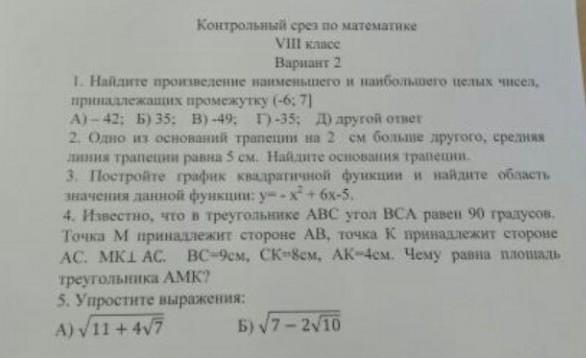 в1) наименьшее целое число -5,наибольшее 7.получаем -5*7=-35