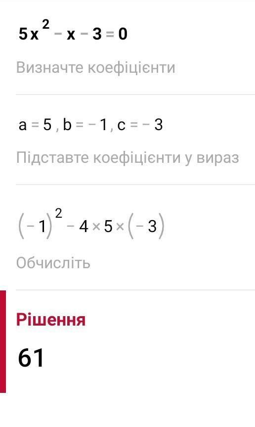 D = b^2 - 4ac = (-1)^2 - 4 × 5 × (-3) = 1 + 60 = 61 (Подходит)