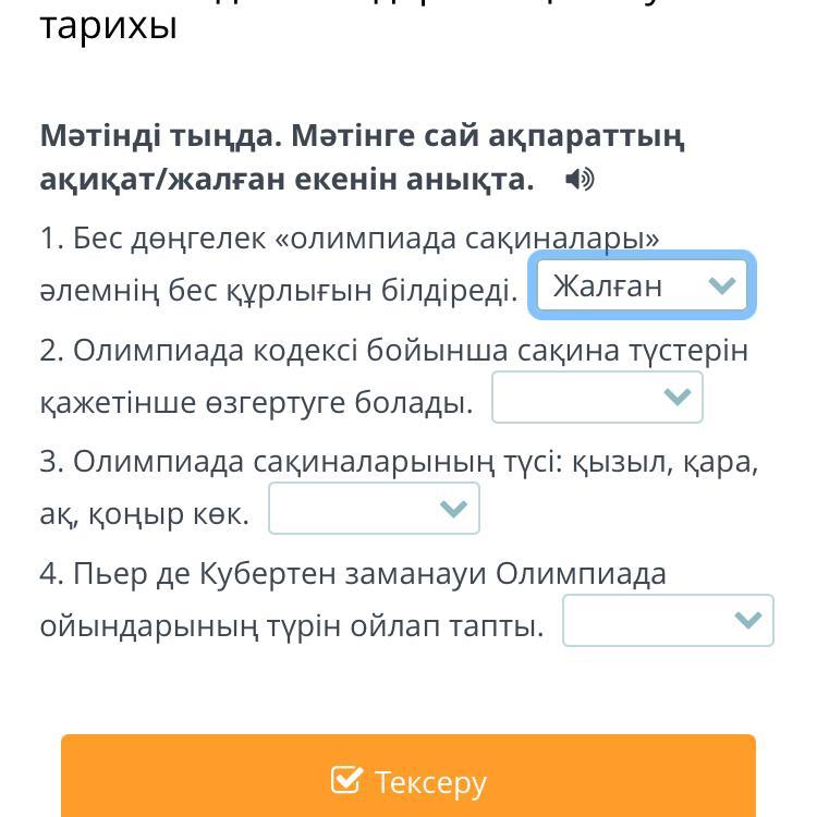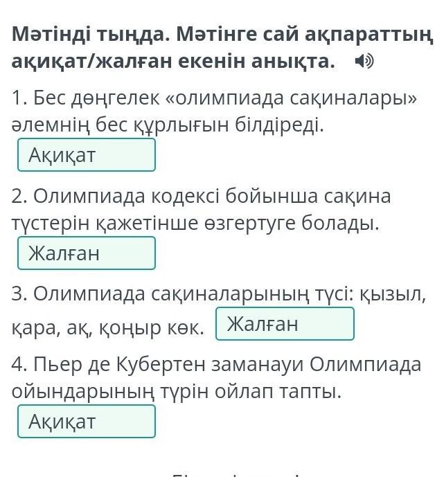 Мәтінді тыңда. Мәтінге сай ақпараттың ақиқат/жалған екенін анықта.
