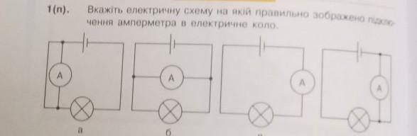 Вкажіть електричну схему на якій правильно зображено підключення амперметра в електричне коло