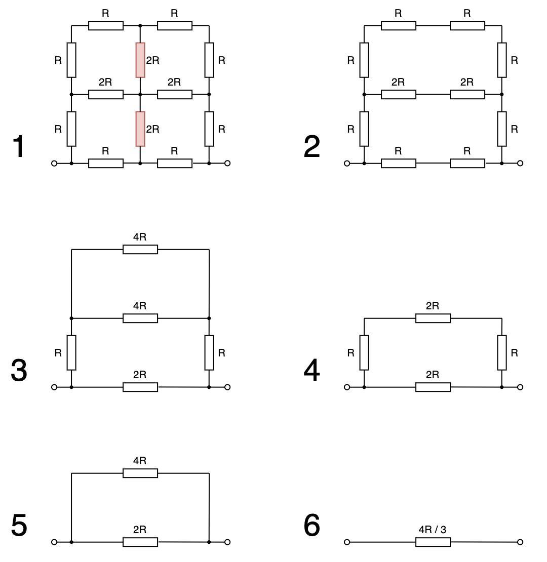 Оставшуюся сеть резисторов легко посчитать путем эквивалентных преобразований и последовательного упрощения схемы. При этом нужно помнить, что: