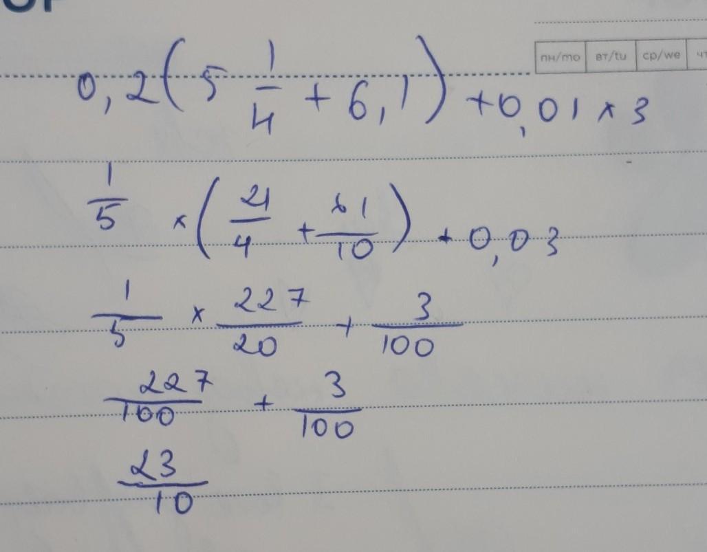 0,2 • (5 1/4 + 6,1) + 0,01 • 3 = 2,3