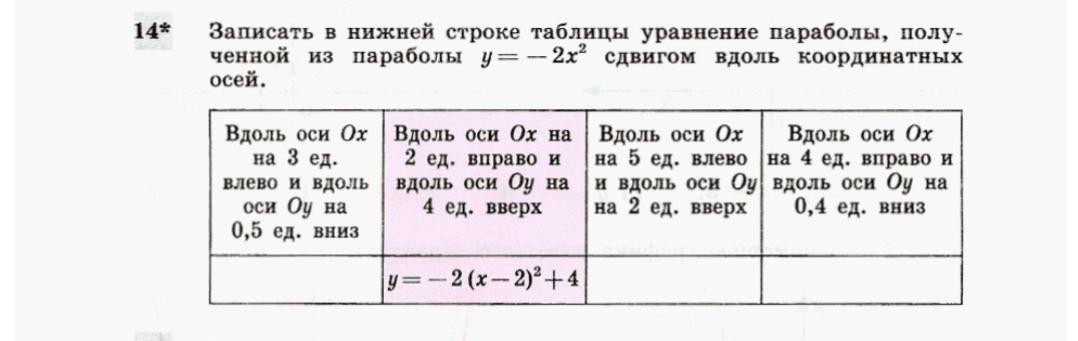 СРОЧНО!!!! записать в нижней строке таблицы уравнение параболы полученной из параболы y=-2x/2 сдвигом вдоль координатных осей
