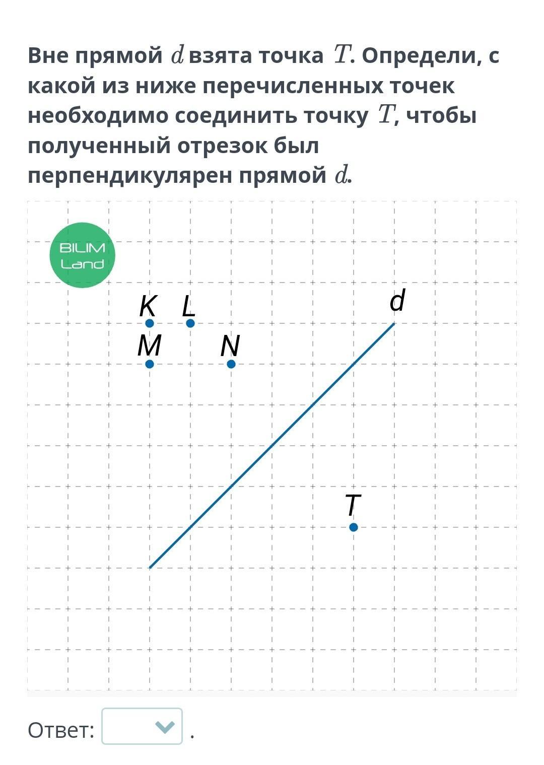 Вне прямой d взята точка T. Определи с какой из ниже перечисленных точек необходимо соединить точку T чтобы полученный отрезок был прямо перпендикулярен прямой d