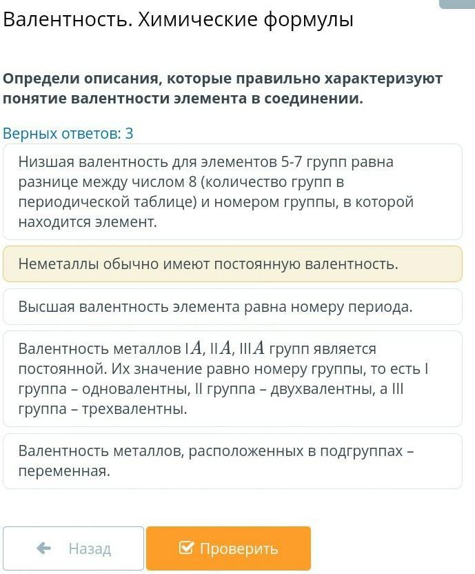 Определи описания, которые правильно характеризуют понятие валентности элемента в соединении.