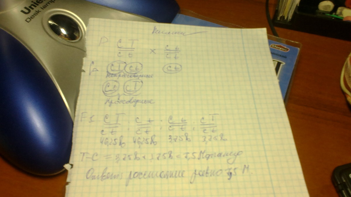 При скрещивании дигетерозиготной по генам C и T самки дрозофилы с рецессивным по обоим генам самцом, в потомстве получены следующие результаты: 46,25% мух фенотипического класса CT; 3,75% мух фенотипического класса Ct; 3,75% мух фенотипического класса cT; 46,25% мух фенотипического класса ct. Определите расстояние между генами C и T.