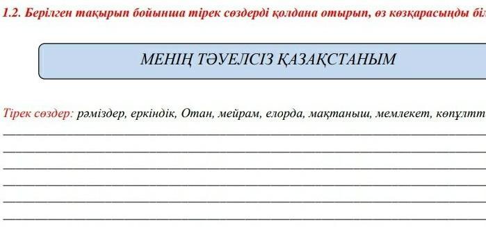 Біз қазір еркіндіктеміз.Біздің рәміздеріміз ол біздің Қазақстанымызды көркейтеді.Отанымыз қазір тәуелсіздікте.Тәуелсіздік алғанымыз ол біздің мейрамымыз.Тәуелсіз болған соң елордамызда көркейді.Тәуелсіздік алуымызды мен мақтаныш ретінде көремін.Біз енді жеке мемлекетпіз және де көпұлттымыз