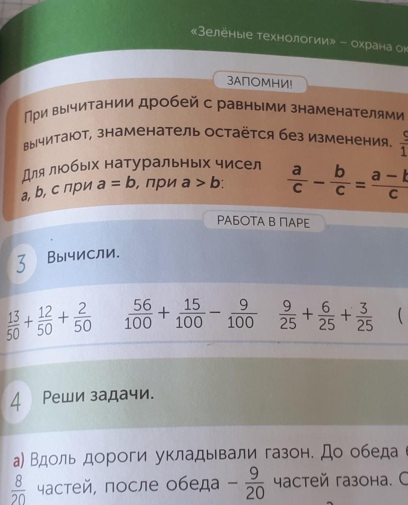 \displaystyle \frac{13}{50}+\frac{12}{50}+\frac{2}{50}=\frac{13+12+2}{50}=\frac{27}{50}\\\\\\\frac{56}{100}+\frac{15}{100}-\frac{9}{100}=\frac{56+15-9}{100}=\frac{62}{100}=\frac{2\cdot 31}{2\cdot 50}=\frac{31}{50}\\\\\\\frac{9}{25}+\frac{6}{25}+\frac{3}{25}=\frac{9+6+3}{25}=\frac{18}{25}