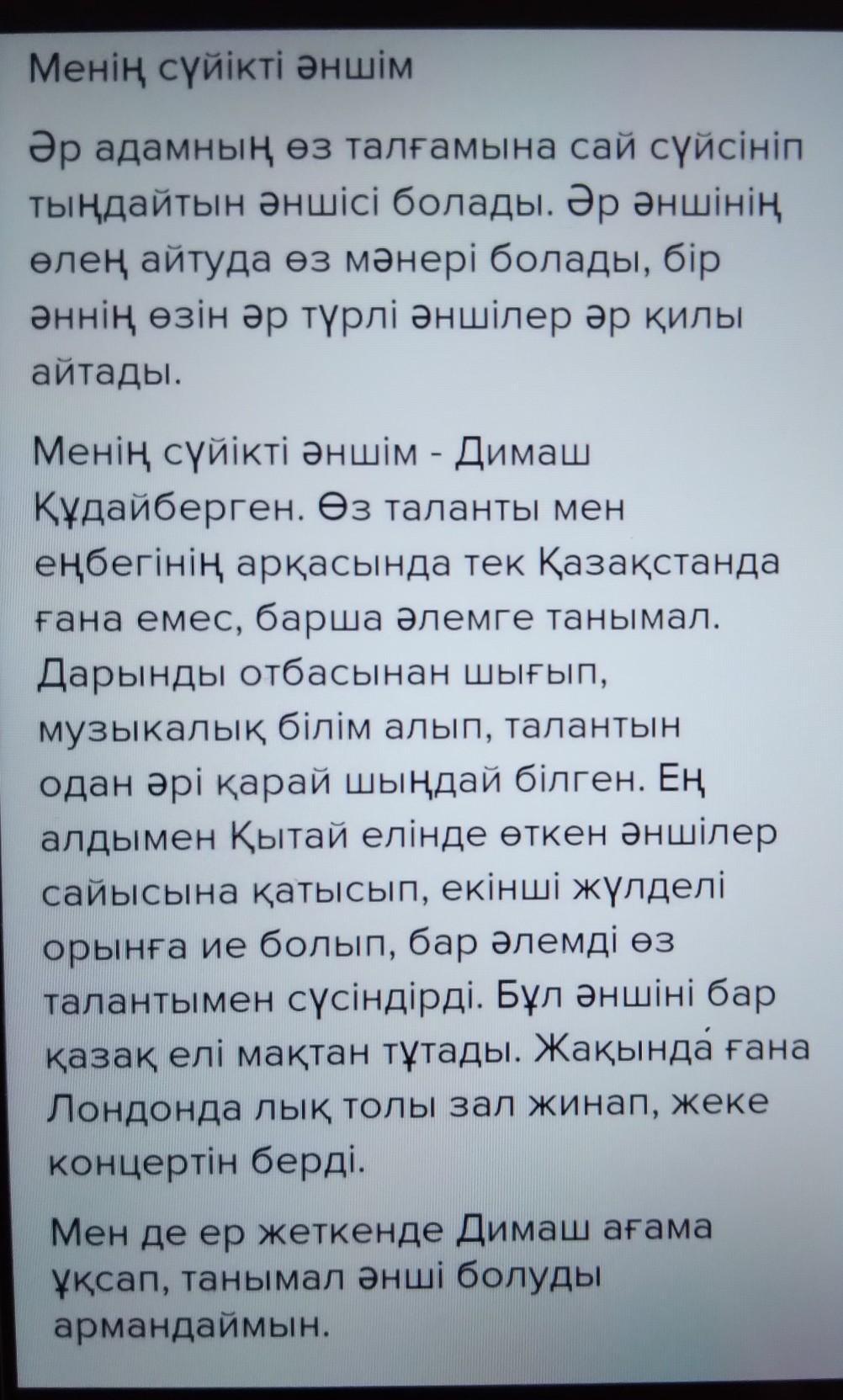 4-тапсырма. Өздеріңнің сүйікті әндерің мен әншілерің, олардың сыртқы