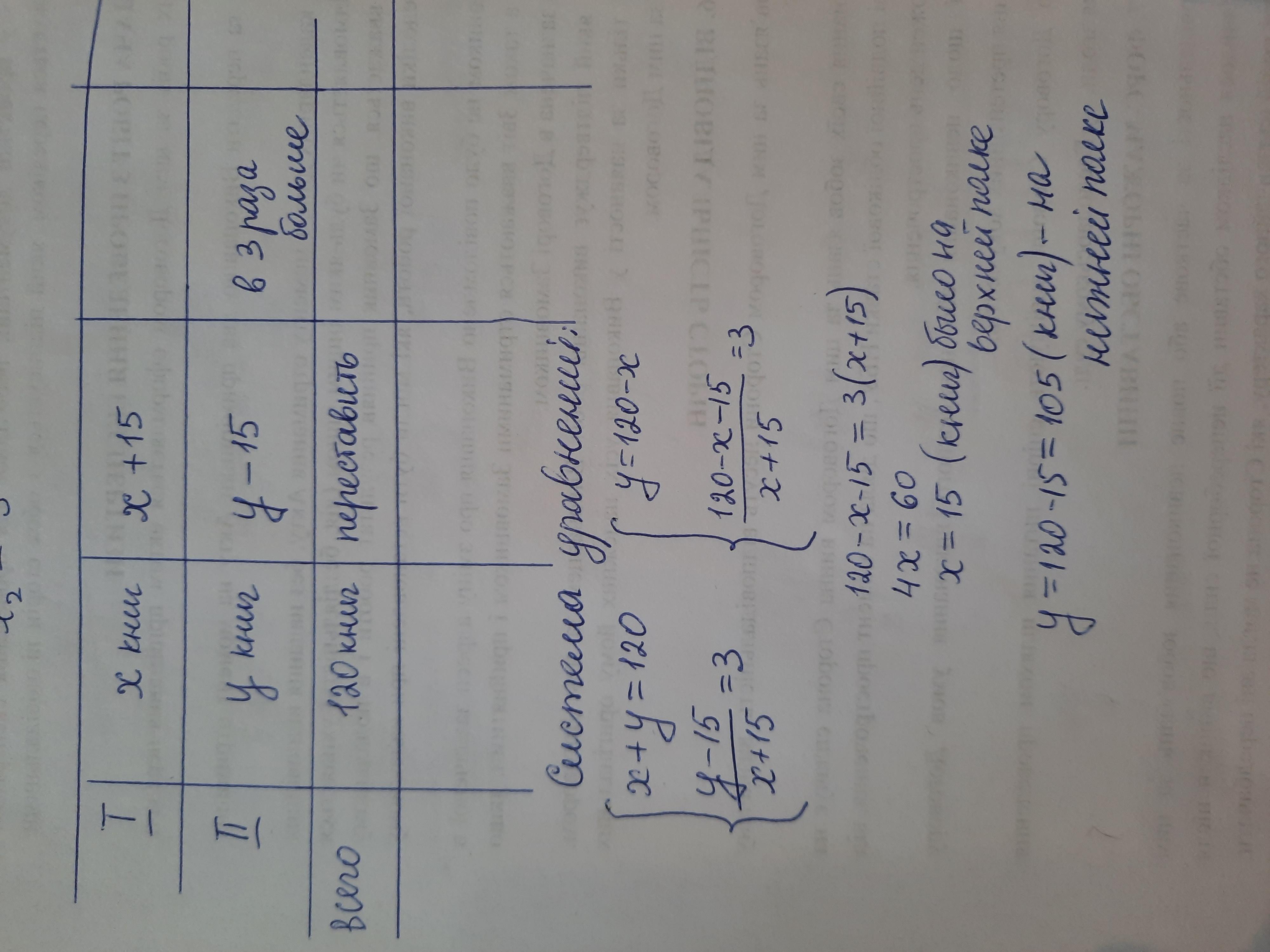 В библиотеке на двух полках стоит 120 книг. Если с нижней полки переставить на верхнюю 15 книг, то на нижней окажется в 3 раза больше книг, чем на верхней. Сколько книг на нижней полке?