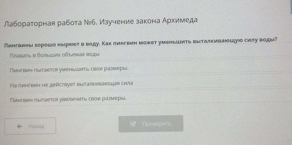 Пингвины хорошо ныряют в воду. Как пингвин может уменьшить выталкивающую силу воды?