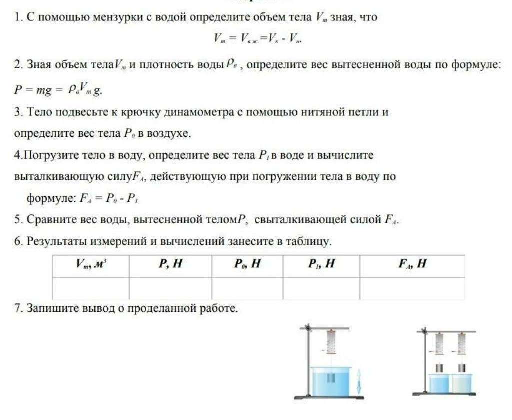 2. Зная объем телаVт и плотность воды, определите вес вытесненной воды по формуле: P = mg = g.