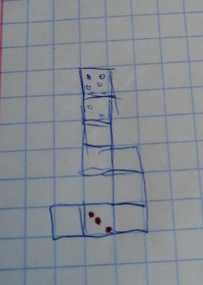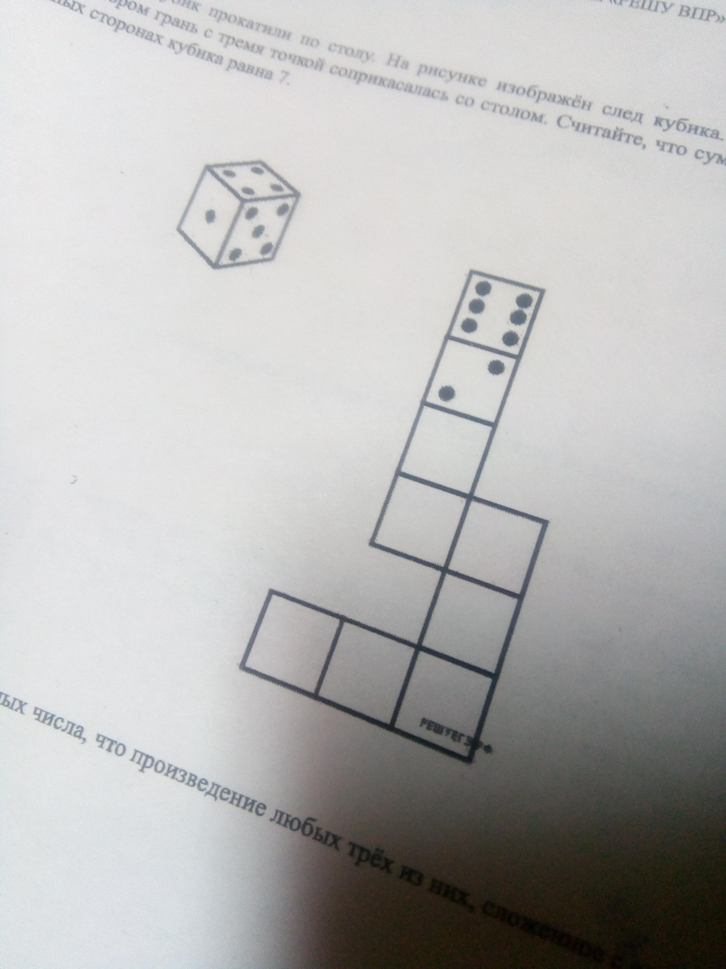 Игральный кубик прокатили по столу. На рисунке изображён след кубика. Отметьте на рисунке место, в котором грань с тремя точками соприкасалась со столом. Считайте, что сумма чисел на противоположных сторонах кубика равна 7.