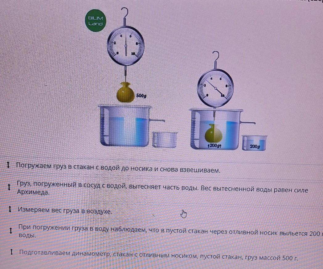 выталкивающей силы. Сопоставьте порядок эксперимента и порядок его выполнения (сверху вниз).