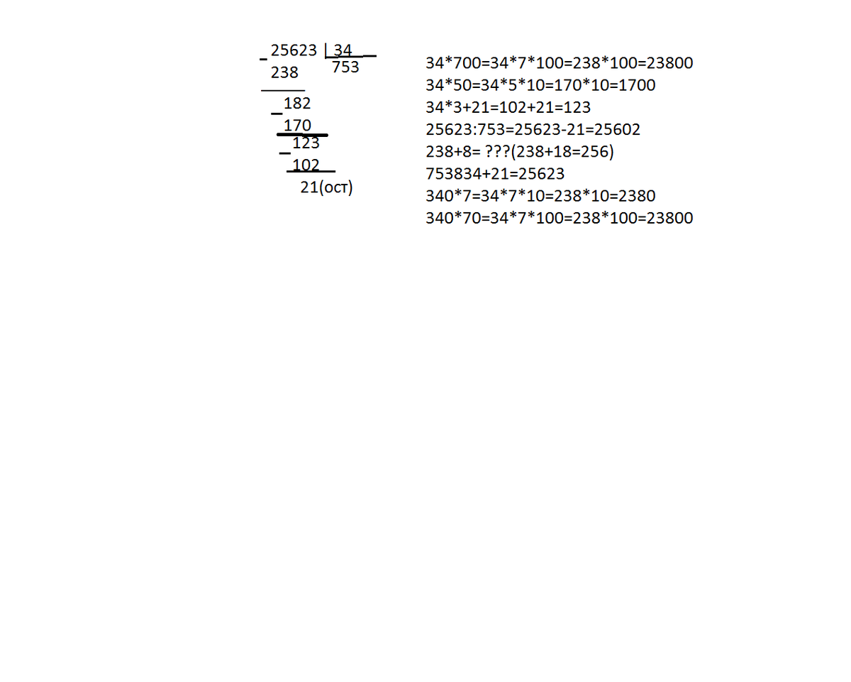 Выполни деление уголком 25623:34 и, пользуясь полученной записью, найди значения выражений: